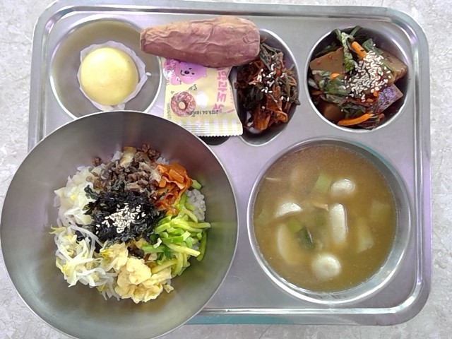 소보로비빔밥(1.5.6.9.16)미니약과도넛(1.5.6)우리밀단호박찐빵(2.5.6)들깨토란탕(2.9.16.18)도토리묵무침(5.6.13)고들빼기김치(9)군고구마* 에너지/단백질/칼슘/철704.60/22.90/156.86/5.59