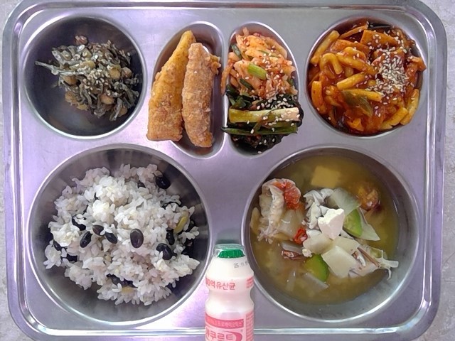 검정콩밥(5)꽃게된장국(2.5.6.8.9.18)찹쌀콩멸치볶음(5.6.13)오징어스틱튀김(1.5.6.17),무생채(13)파김치(자율)(9)누들우리밀볶이(1.5.6.13)저당요구르트(2)* 에너지/단백질/칼슘/철592.52/26.11/342.78/4.60