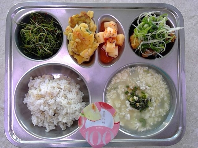 혼합잡곡밥(5)초당순두부국+양념장(2.5.9.18)파닭(5.6.13.15)새우살애호박전(6.9.13)깍두기(자율)(9)부추세발나물무침(13)복숭아맛호상요구르트(2)* 에너지/단백질/칼슘/철642.43/38.26/220.97/4.44